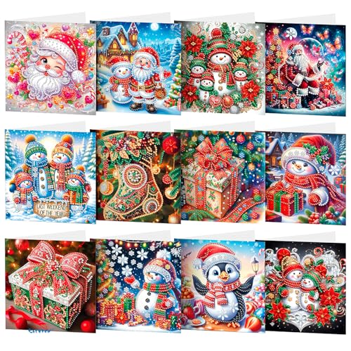 Diamantmålning Julkort, CAYUDEN 12pcs DIY Diamant Gratulationskort Kit med Kuvert för Vuxna Jul Gratulationskort Gör-det-själv Diamantmålning Glada Julkort Set Julklappar för Familjer, Vänner, Partner