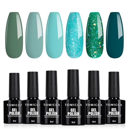 TOMICCA UV-nagellack blågrönt glitterset, 6 färger höstglitter gelnagellack som blötläggs av UV/LED-present giftfri och långvarig, julklappsset för nybörjare nagelkonstsalong DIY-hem, 8 ml
