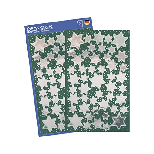 AVERY Zweckform 96 klistermärken julstjärnor silver (Made in Germany, julklistermärken glanspapper, självhäftande juldekoration för kort, presenter, påsar) 2 ark / 48 stjärnklistermärken, 52812