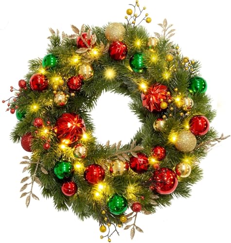 Avoalre 40CM Julkrans Med Ljus 40LED, Julkrans Med Röda Och Gröna Gyllene Bollar Christmas Wreath with Lights, 8 Lägen Timer-Funktion Julbelysning Dörr, Träd, Vägg, Fönsterdekoration