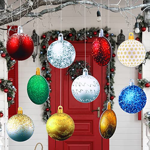 10 stycken utomhus dubbelsidiga gräsmattor dekorationer hängande färgglada julprydnader stora runda gårdsdekorationer med 91 meter silversladd för semesterveranda och träddekor (blixtstil)