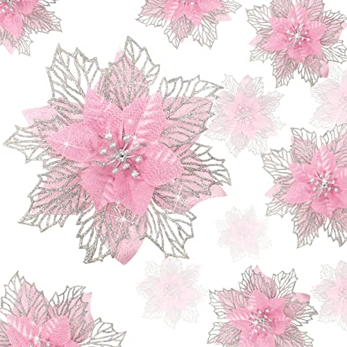 Geosar 36 st julstjärnor blommor träddekor konstgjord fuskglitter julprydnader nyår för fest favorit (rosa)