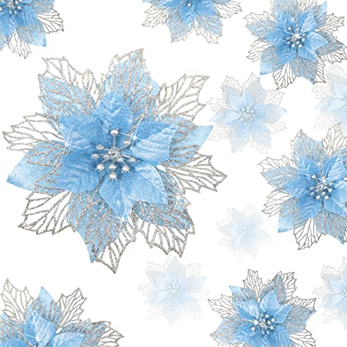 Geosar 36 st julstjärnor blommor träddekor konstgjord fuskglitter julprydnader nyår för festpresent (blå)