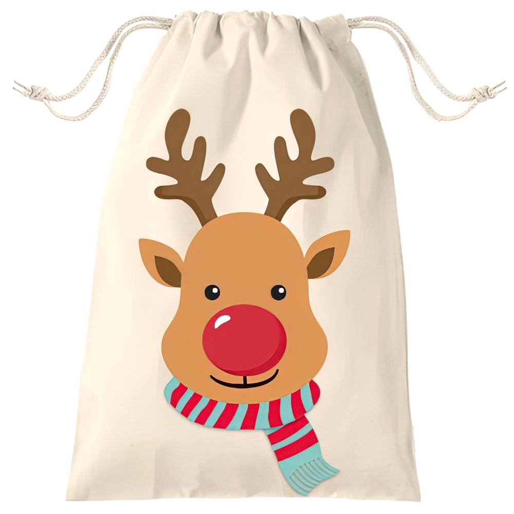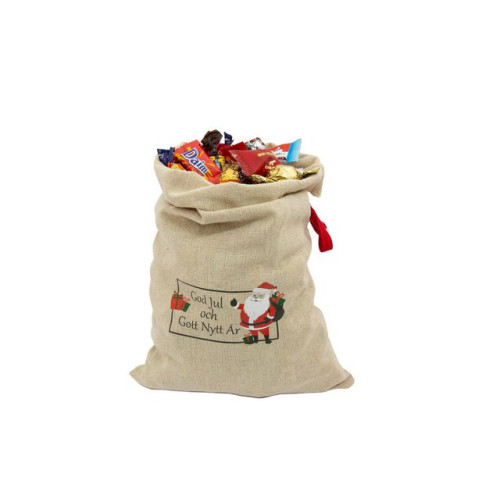 Idena 30536 – jutesäck ca. 49 x 63 cm, tygpåse med jultomtemotiv, ren och inskription God jul, julsäck med rött snöre