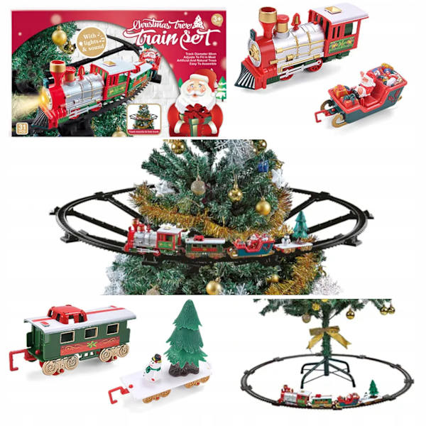 BAKAJI Jultåg med stativ för träd centrum elektriskt tåg lokomotiv ljus 3 vagnar juldekorationer diameter 89 cm barnleksak