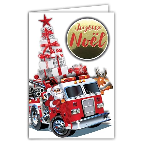AFIE God jul kort glänsande textrelief collage med vitt kuvert 12 x 17,5 cm - jultomte röd brandbil ren gran pyramid stjärngåvor bästa önskningar för barn familj
