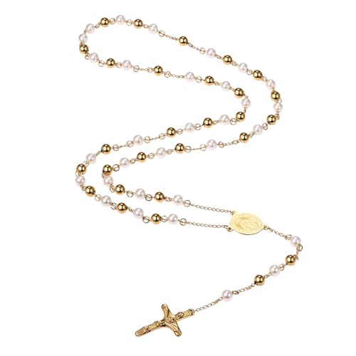 Flongo Kristus kors radband halsband: Jungfru Maria hänge halsband - Jesus krucifix rostfritt stål gåva med Sankt Benedikt-medalj för kvinnor, Rostfritt stål