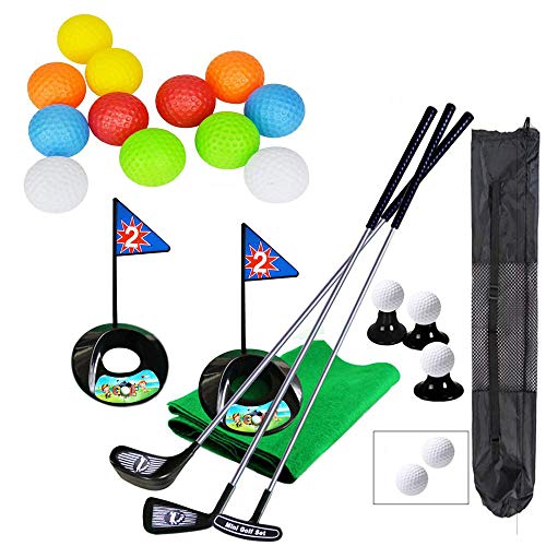 SOWOFA Golfleksak set för barn, golfklubb, metall, golfklubbslogotyp, praktisk sport med bollspel, inomhus, golf, 61 cm, träning, 17 stycken, med ryggsäck, 12 golfbollar gratis
