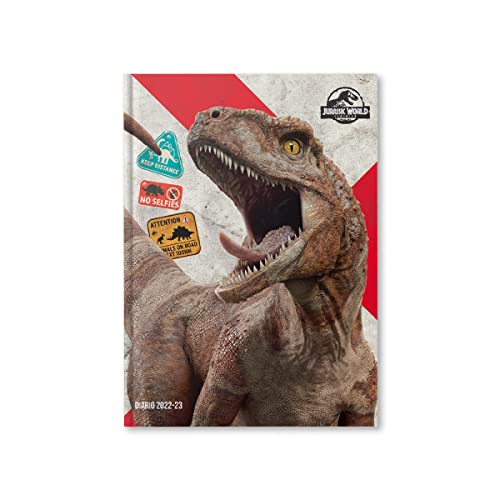Jurassic World - Skoldagbok daterad, 10 månader, september 2022 - juni 2023, skoldagbok med klistermärke, 320 sidor, mjukt vadderat omslag, storlek 14,2 x 19,3 cm, Dinosaurieöverdrag