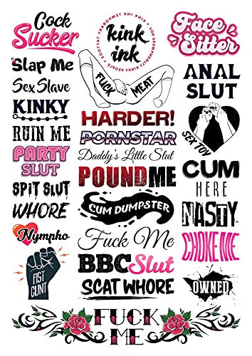 Kink Ink - 27 Temporary Tattoos Adult Sexy Naughty Hardcore Words and Phrases, Long Lasting Semi Permanent Small to Medium Sized Fake Tattoos for Men and Women on A4 Sheet