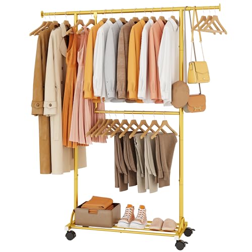 FAVOOSTY Klädställ på hjul, mobilt klädställ med utdragbar klädstång, klädhängare med dubbel klädstång, klädhängare av metall justerbar garderob (90–120) x 39,5 x 160 cm, gyllene