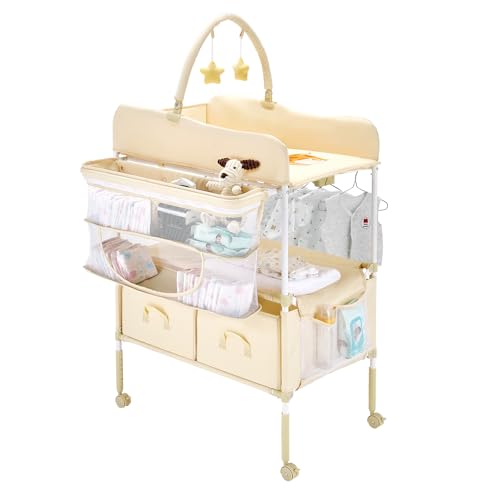 VEVOR Baby skötbord, vikbar blöjbytesstation med 2 tyglådor, sidokorg och hängande stång, justerbar höjd, bärbart skötbord med låsbara hjul och 2-stjärniga leksaker, ljusbeige