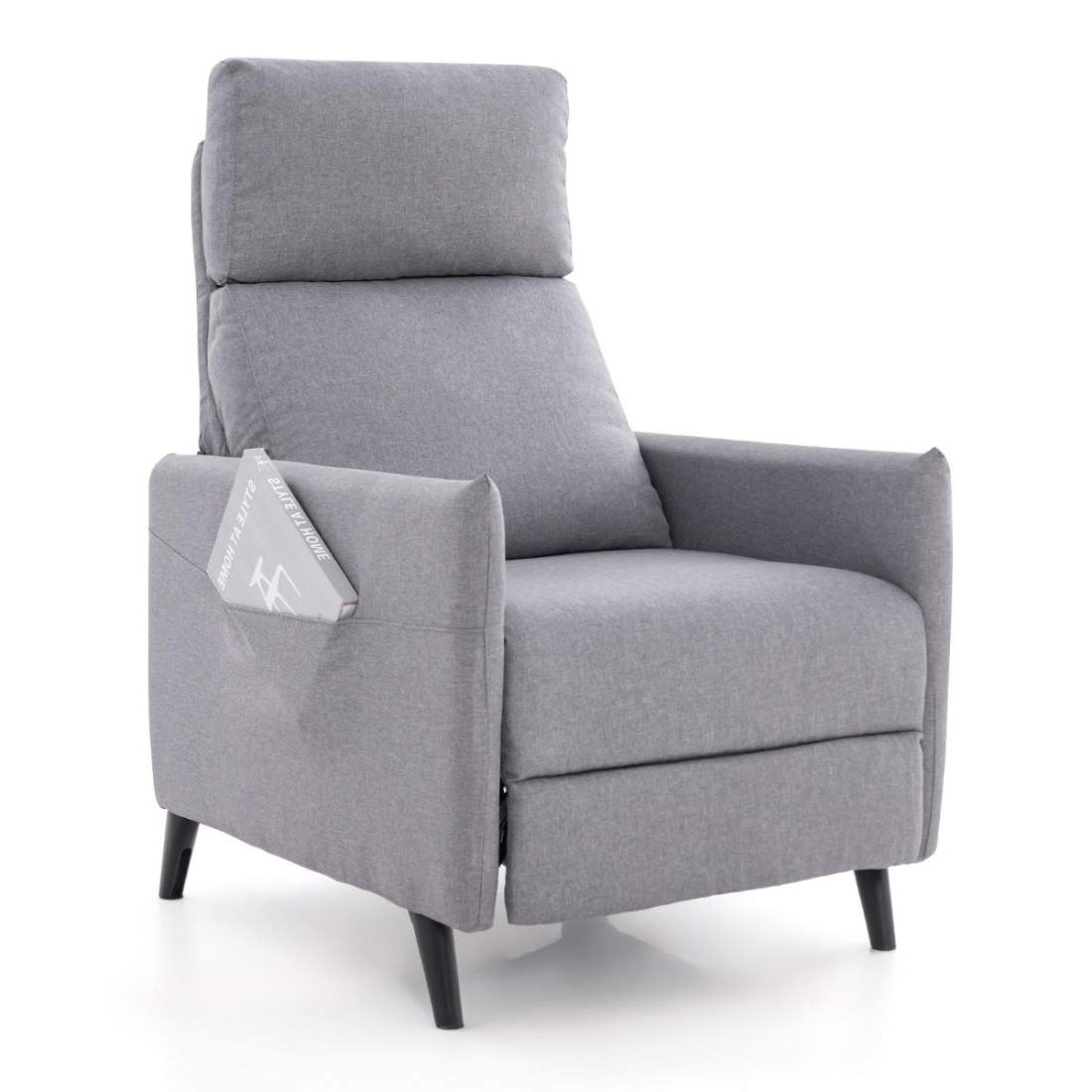 Fåtölj av björkträ, stoppad stol med justerbart fotstöd, modern fåtölj, ljusgrå