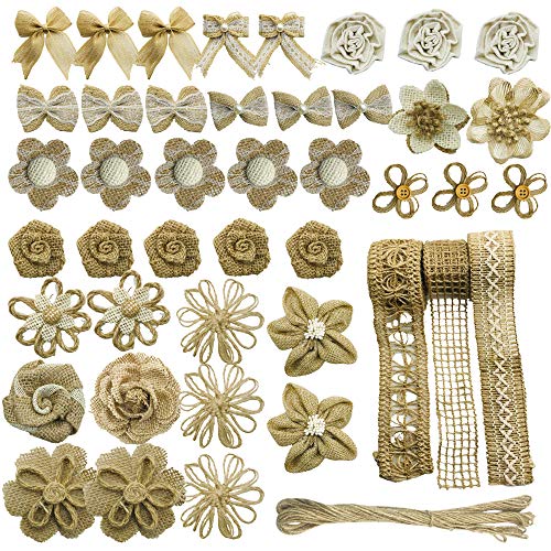 Allazone 46 st juteblomma, säckvävsblommor, 40 st handgjorda blommor och knutar, 4 rullar juteband för bröllopsfest, gör-det-själv hantverk