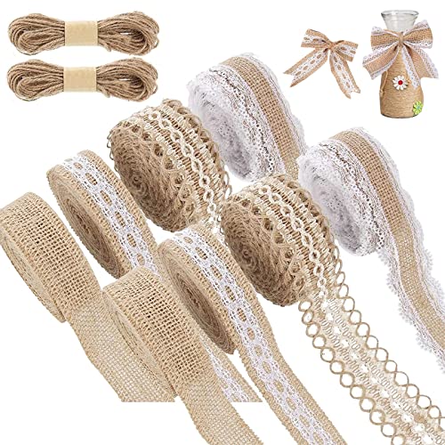 JOKILY 8 rullar juteband vintage spetsband, naturligt linne, vitt spetsband, 20 m hamparep, vita spetsar, för bröllop, jul, dekoration, fest, pyssel, gåva