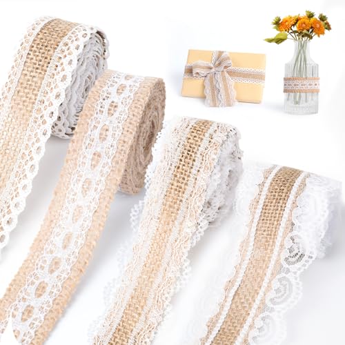 AiQInu 4 rullar juteband med 2 m spets, juteband tyg dekoration, vintage hantverk band för gör-det-själv hantverk bröllop fest band present
