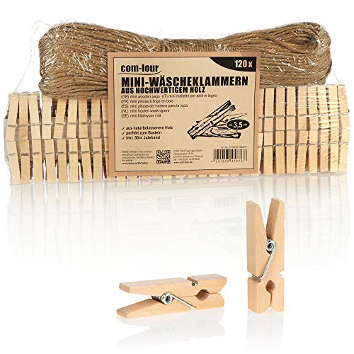 COM-FOUR® 120x mini klädnypor och 50 m jute rep, små träpinnar som dekoration för bilder, collage, vykort, foton & turgåvor (120 stycken - med juteband - natur)