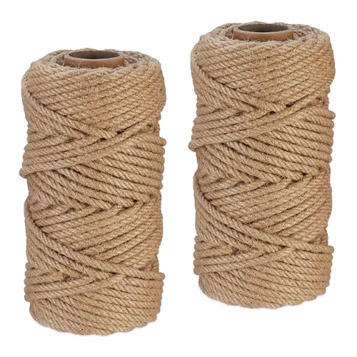 Relaxdays Jutesnöre 6 mm, 2 rullar jutegarn 50 m, biologiskt nedbrytbart, hantverk, trädgård, förpackning, sladd, natur