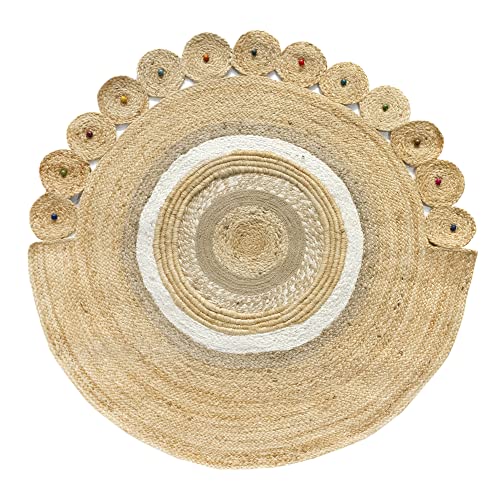 THE PIKKU INTERNATIONAL - jutematta handflätad rund vit tofsle område matta boho trasmatta vardagsrum hall matta, beige och vit (120 x 120 cm)