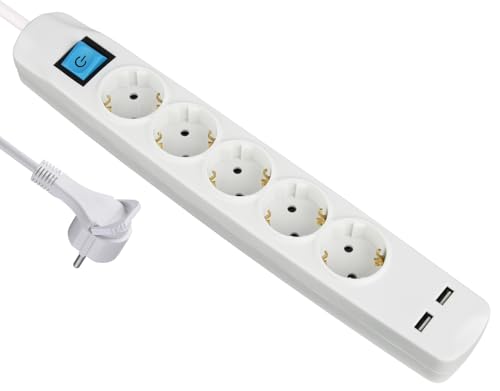 MAXTRACK NV58-3WL 5-vägs grenuttag med USB, platt skyddskontakt, 2 USB-laddningsuttag, flera uttag med handtag för att dra ut, kabelbindning, platsbesparande och robust