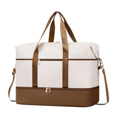 COOLIFE Resväska, stor 50 cm, damer, weekender, handbagage, väska, sportväska, klinikväska, födsel med skofack och separat våtväska, vattentät för flygplan, resor, gym, Vit/brun, 50×25×34 cm, Resväska