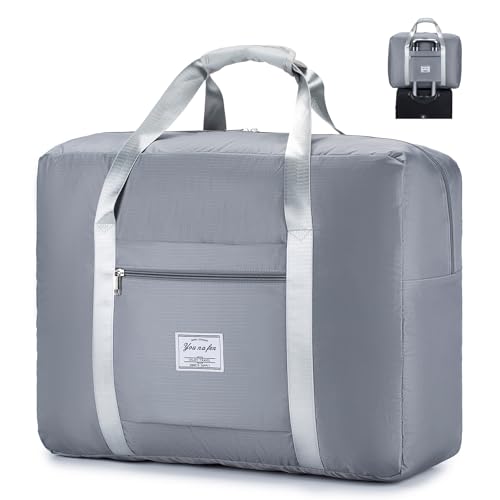SPAHER Duffelväska Resväska Stor Hopfällbar Resväskor Handbagage 55x40x20 TUI Airways Lufthansa Lätt Kabinväska 45L Packable Holdall Vattentät Handväska för Män och Kvinnor Grå