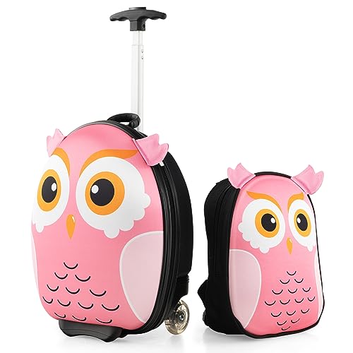 COSTWAY 2 stycken barnväska med ryggsäck, 30 cm (12 tum) 16 tum barnvagn bagage med hjul och 3 stegs teleskophandtag, handbagage hårt skal fodral för flickor och pojkar, Uggla, 12”+16”, barnbagage