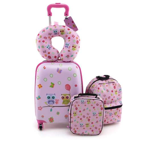 COSTWAY 5-delad barnresväska + ryggsäck, barnvagn med lunchlåda, bagageetikett och nackkudde, barnbagage med hjul, handbagage resväska med hårt skal för pojkar och flickor, Rosa uggla, 30 cm x 23 cm x