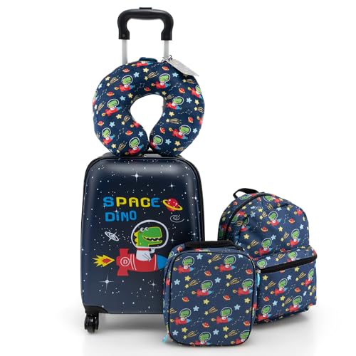 COSTWAY 5-delad barnresväska + ryggsäck, barnvagn med lunchlåda, bagageetikett och nackkudde, barnbagage med hjul, handbagage resväska med hårt skal för pojkar och flickor, dinosaurier, 30 cm x 23 cm
