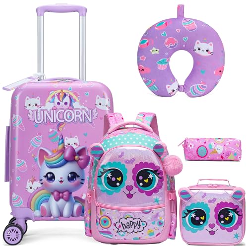 FANTASK 5 TLG Barnväska, barnbagage med ryggsäck och matlåda, bagageetikett & nackkudde, barnvagn med hjul, handbagage resväska hårt skal för barn från 6 år (enhörning), Enhörning, 30 cm x 23 cm x 53