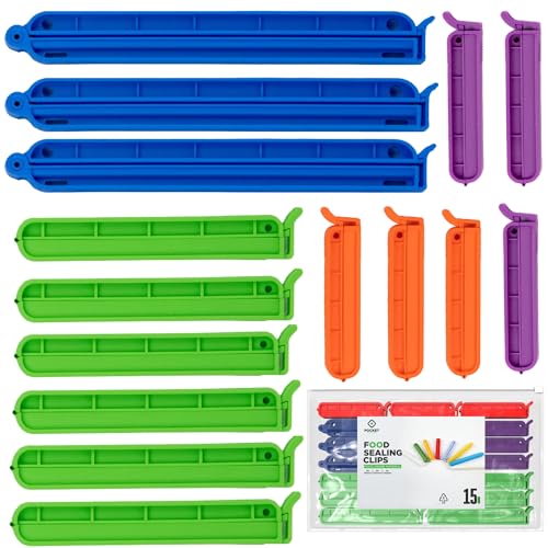 Påsklämmor – paket med 15, 3 olika storlekar och 4 färger för att försegla mat, mellanmål, kaffe, flingor – återanvändbar plast lufttät påsförseglingsklämmor för hem, kök och kontor