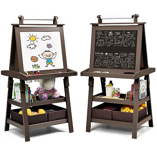 COSTWAY 6-i-1 barnstaffliset, stående tavla av trä med dubbelsidig krittavla & whiteboard & pappersrulle, barntavla justerbar höjd med bänk, hyllor för barn från 3 år (kaffe)