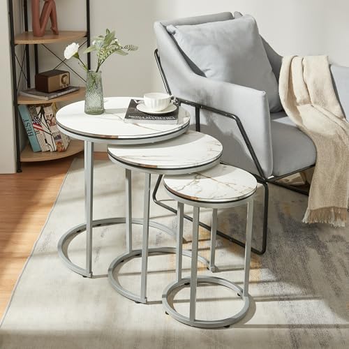 moebel17 1069 Sidobord, set om 3 runda kaffebord, set med metallram, vardagsrumsbord, soffbord, vitt, marmorutseende, silverfötter, 38 cm diameter, höjd 46, 49, 52 cm