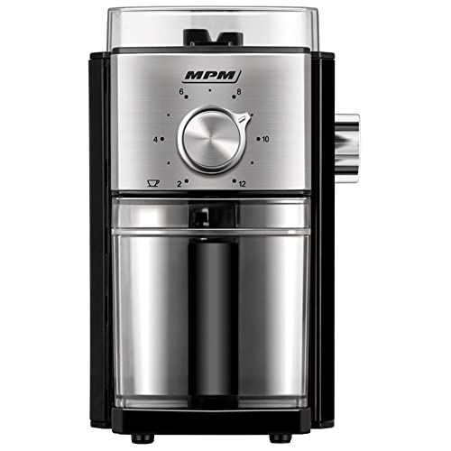 MPM MMK-08 Professionell kaffekvarn, stålslipsystem, 17 malningsinställningar, 80 g/min kaffe för alla kaffebryggare, kvantitetsväljare 2 till 12 koppar, kapacitet 350 g, 150 W
