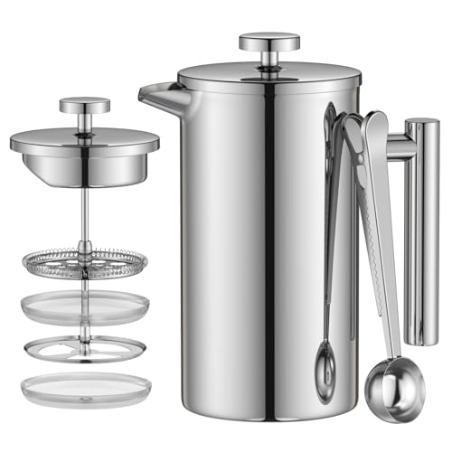 Enfmay Cafetière 8 koppar fransk press kaffebryggare, 1 000 ml 3 nivåfilter dubbelväggigt isolerat rostfritt stål fransk presskaffettiere för hem och kontor, extra 1filter och 2-i-1 klämsked