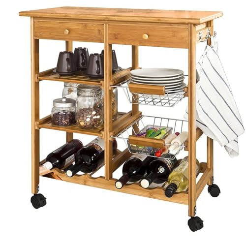 BAKAJI Köksvagn i bambu trä med hylla skärbräda lådor bestickhållare kaffekapselhållare flaskhållare metall fruktkorgar utdragbara hyllor och 4 snurrhjul