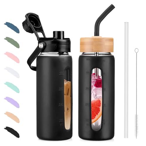 BLUEGO 600 ml glasvattenflaska med sugrör och 2 lock kaffekopp av glas med tidsmarkering och silikonskydd glasbägare för drycker Soda Cola BPA-fri, svart