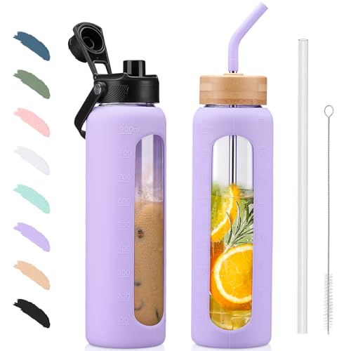 BLUEGO 900 ml glasvattenflaska med sugrör och 2 lock glas kaffekopp med tidsmarkör och silikonskydd glasbehållare för drycker Soda Cola BPA-fri, lila