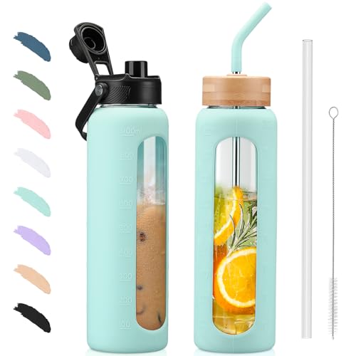 BLUEGO 900 ml glasvattenflaska med sugrör och 2 lock kaffekopp av glas med tidsmarkering och silikonskydd glasbägare för drycker soda cola BPA-fri, Oliver
