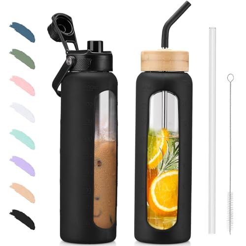 BLUEGO 900 ml glasvattenflaska med sugrör och 2 lock glas kaffekopp med tidsmarkör och silikonskydd glasbehållare för drycker Soda Cola BPA-fri, svart