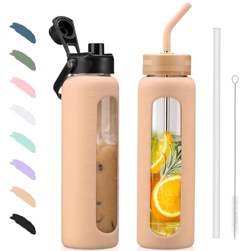 BLUEGO 900 ml glasvattenflaska med sugrör och 2 lock glas kaffekopp med tidsmarkör och silikonskydd glasbehållare för drycker Soda Cola BPA-fri, bärnsten