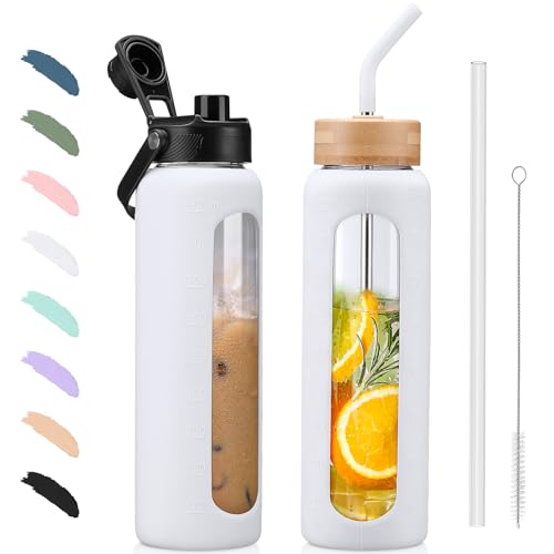BLUEGO 900 ml glasvattenflaska med sugrör och 2 lock glas kaffekopp med tidsmarkör och silikonskydd glasbehållare för drycker Soda Cola BPA-fri, vit