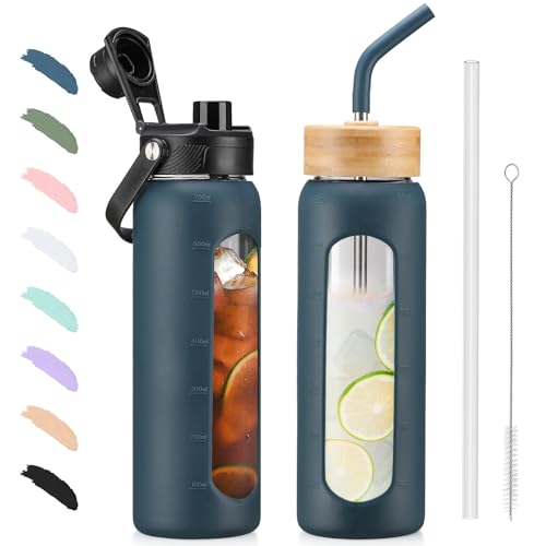 BLUEGO 900 ml glasvattenflaska med sugrör och 2 lock glas kaffekopp med tidsmarkör och silikonskydd glasbehållare för drycker Soda Cola BPA-fri, mörkblå