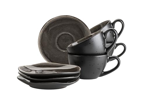 MÄSER 934071 serie Niara Organic, modernt kaffekopp-set för 4 personer i spännande vintageutseende, 8-delat kaffekopp-set med speciell glasyrkombination i svart och brun, stengods