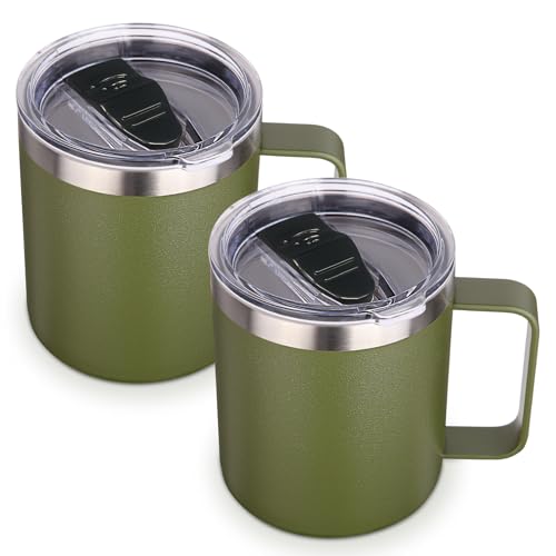Volhoply 410 ml isolerad rostfritt stål kaffemugg med läcksäckt lock, 2-pack, dubbelväggsvakuum reskaffemugg med handtag, campingmugg håller varm/kall (Armegrön, 2)