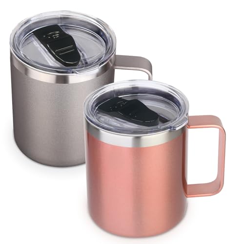 Volhoply 410 ml isolerad rostfritt stål kaffemugg med läcksäckt lock, 2-pack, dubbelväggsvakuum reskaffemugg med handtag, campingmugg håller varm/kall (Blandning, 2)