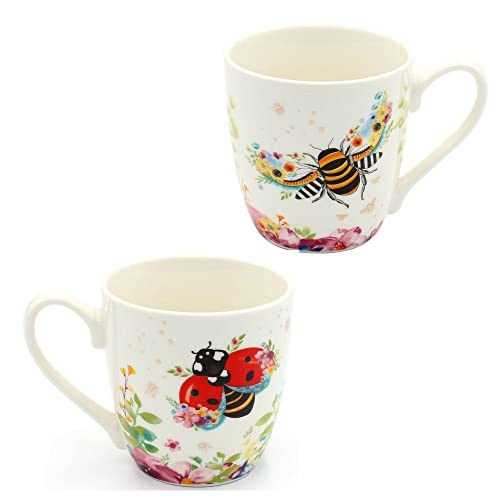 Dekohjälden24 set med 2 kaffemuggar i porslin – motiv: bi och nyckelpiga – storlek H/Ø: 10 x 9 cm, kapacitet 400 ml, diskmaskinssäker