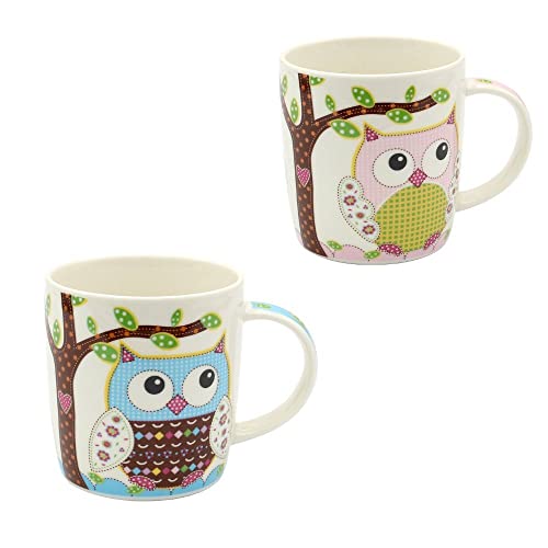 Dekohjälden24 set med 2 kaffemuggar i porslin – motiv: Färgglada ugglor i blått – rosa – storlek H/Ø: 9,5 x 8,5 cm, kapacitet 350 ml, diskmaskinssäker