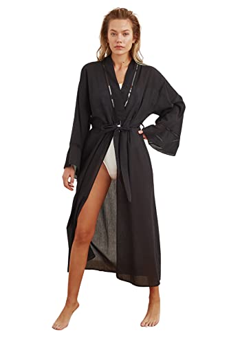 Trendyol Strandkläder för kvinnor, vanliga V-ringade vävda kimonos och kaftaner, Svart, L