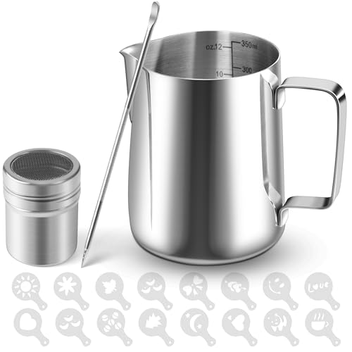 Mjölkkanna, 350 ml. Mjölkkanna rostfritt stål med mätmärke, kakaoströare, 16 latte konststenciler och pennor, mjölkkanna för cappuccino, espresso, latte art, kaffekärlek, silver